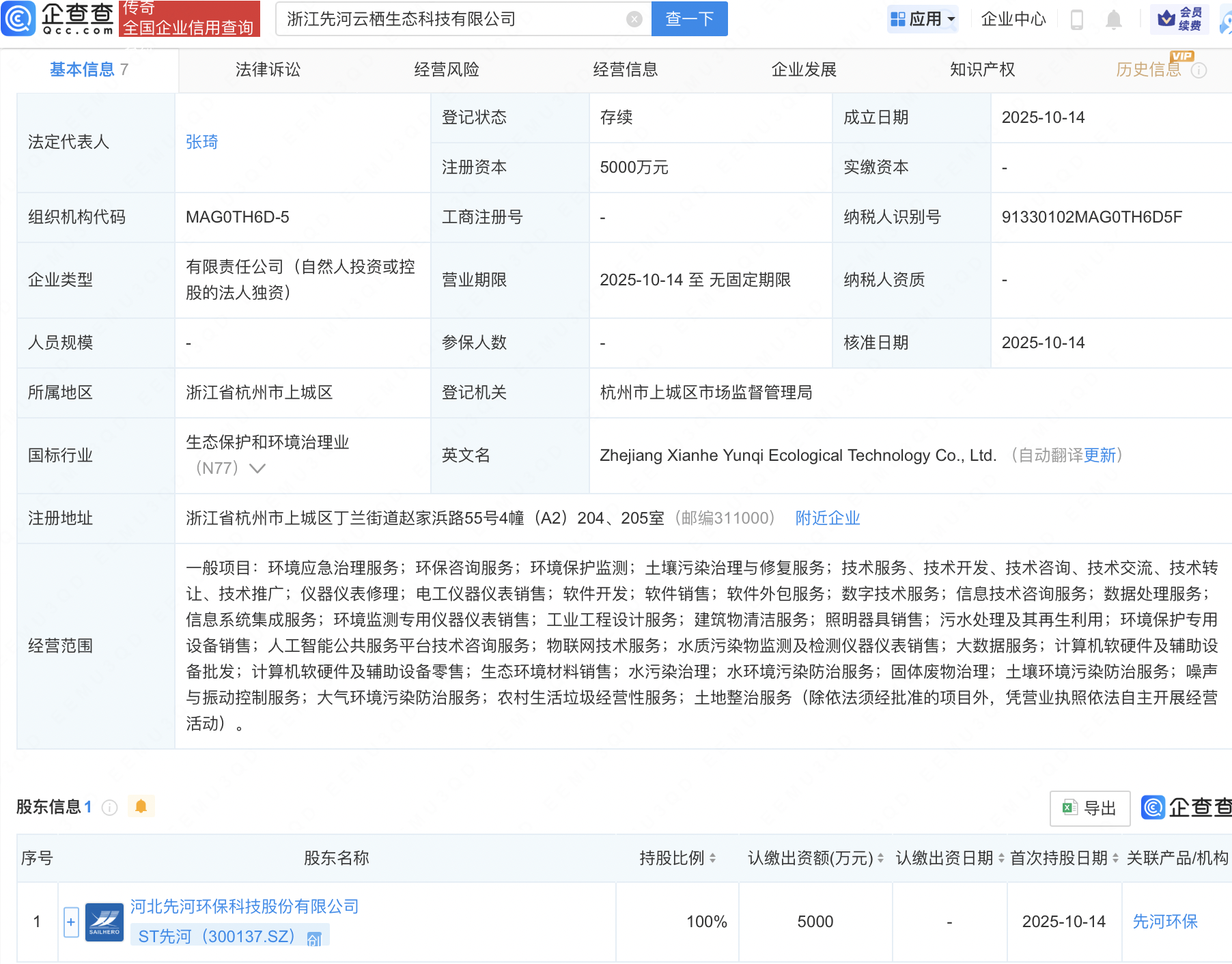 近日,浙江先河云栖生态科技有限公司成立,注册资本5000万元,经营范围包含:环境保护专用设备销售;人工智能公共服务平台技术咨询服务;物联网技术服务等。企查查股权穿透显示,该公司由ST先河(300137)全资持股。